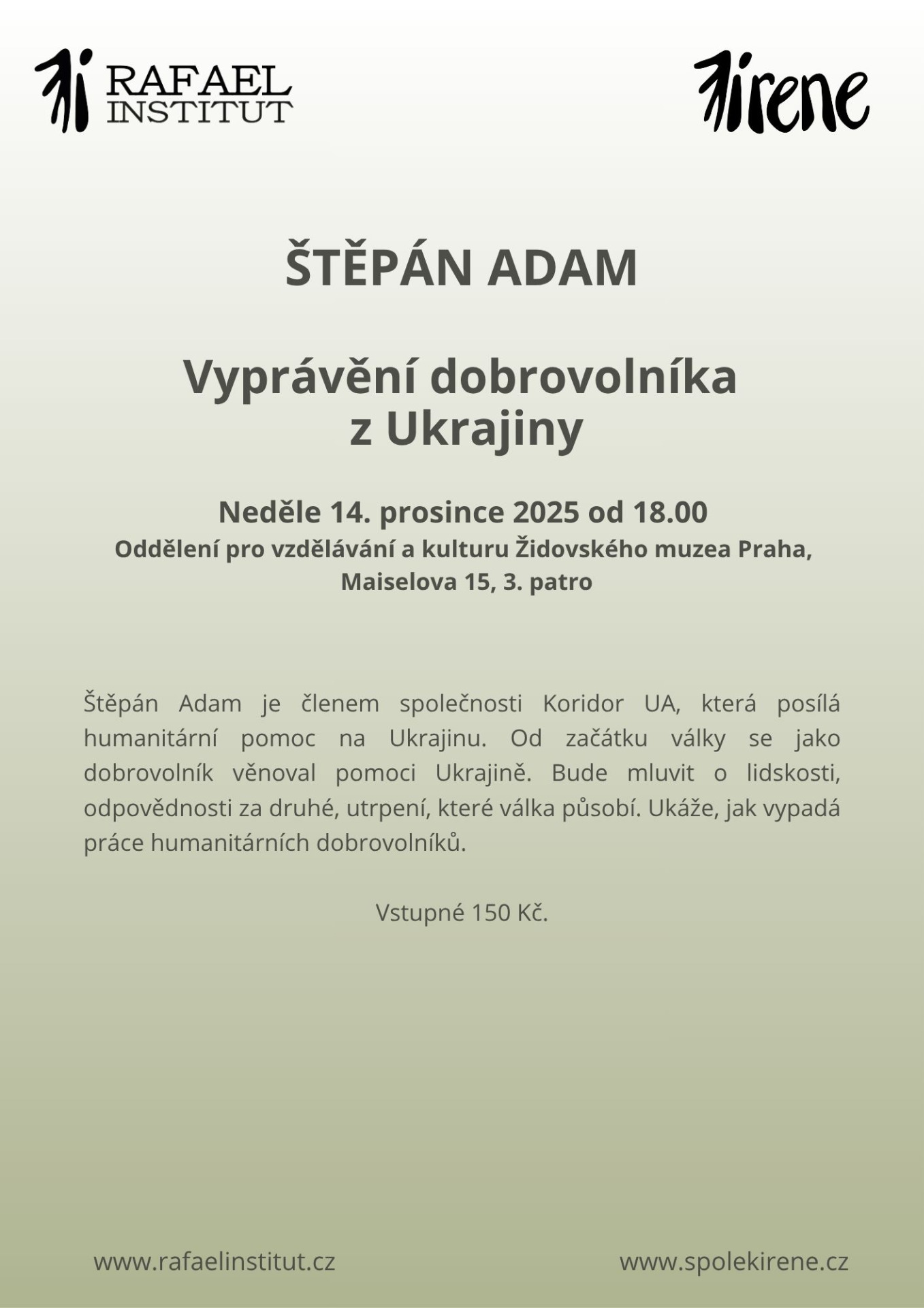 Srdečně Vás zveme na vyprávění Štěpána Adama o tom, co obnáší práce dobrovolníka neziskové organizace. Přednáška se bude konat 14. 12. 2025 v prostorách Oddělení pro vzdělávání a kulturu Židovského muzea, Praha 1, Maiselova 15, 3. patro, v 18.00.